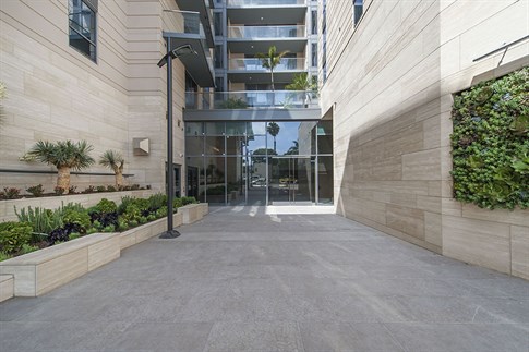 Thanks to a CUSTOM tile installation system with sound reduction, residents at an oceanside condo development are listening to waves, not footsteps overhead. This mid-rise project in Santa Monica, Calif. showcases large format natural stone tile in 150 luxury condos and penthouses. Located just one block from the Pacific Ocean, the LEED Silver certified residences are adjacent to famous attractions like the Santa Monica Pier and the 3rd Street Promenade.