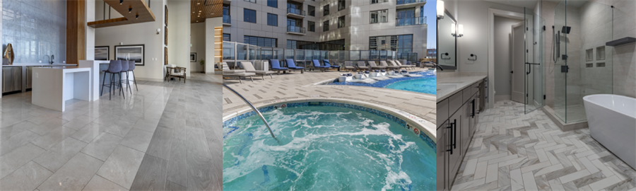 Parq on Speer and the Ascent Union Tower aim to wow visitors and residents with large format and specialty tile in both common areas and inside the apartment homes themselves. Tile is also used extensively in the outdoor living spaces such the pool complexes, a swanky dog park and multiple entertainment kitchens. In some spaces, the size of the tile and the extreme thermal cycling in the Rockies dictated use of a premium quality modified mortar exceeding ANSI A118.15HT to support heavy tile horizontally as well as vertically. This article will focus primarily on the products and tile installed at Parq, the larger of the two projects, as there is a great deal of similarity in the assembly systems.