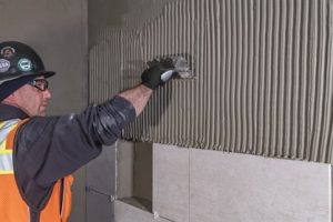 The smaller tiles – including backsplashes like 3 x 9 inch and mosaic glass, ceramic subway tile, 4 x 12 inch porcelain in herringbone patterns and 3 x 3 shower floors – were set with VersaBond® Professional Thin-set Mortar, which cures quickly, even in cold weather. Many of the larger floor and wall tiles were embedded using VersaBond®-LFT Large Format Tile Mortar, a non-sag, non-slump solution for large and heavy tile that exceeds ANSI A118.4HT and A118.11. These tile formats included 12 x 24, 18 x 36 and 24-inch square porcelain on bathroom floors, walls and corridors plus plank tiles measuring 8 x 48 inches. Large format tiles were set with industry-approved techniques such as back troweling, large notch trowels and straight ridge combing to improve wet mortar transfer to the back of the tile and help prevent any voids under the tile.
