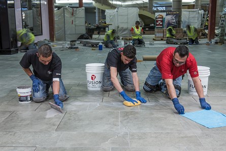Fusion Pro is stain proof and color perfect, plus it’s ready-to-use and easy to spread and clean. Unlike typical epoxy alternatives, Fusion Pro’s patented formula will not discolor when exposed to sunlight through the atrium roof of the shopping center. Because Fusion Pro is applied and then cleaned immediately, with no need to return for sealing, crews grouted continuously through the night to keep retailers open for business during the remodel.