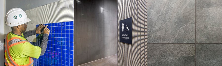 PCL Construction, an international firm known for its expertise with airport and entertainment projects, served as Construction Manager. Edmonton area large commercial specialist Cralan Enterprises, Ltd. was the tile contractor at the arena. Both of these construction partners worked closely with CUSTOM to ensure that every detail of the tile installation at Rogers Place exceeded expectations.