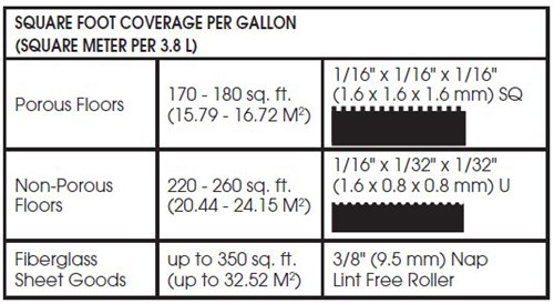 Chart for estimating purposes. Coverage may vary based on installation practices and jobsite conditions. For more sizes, use the material calculator at CustomBuildingProducts.com or contact CUSTOM Technical Services at 800-282-8786.