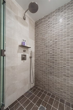 Bathroom floors, showers and tub surrounds were all treated with RedGard® Waterproofing and Crack Prevention Membrane. RedGard is a liquid-applied elastomeric membrane that bonds to a variety of surfaces including drain assemblies and provides a continuous barrier to both water and moisture vapor. It is listed with IAPMO as a shower pan liner and exceeds all applicable ANSI standards for waterproofing. RedGard also isolates cracks up to 1/8″ to protect the natural stone tiles over suspended flooring.