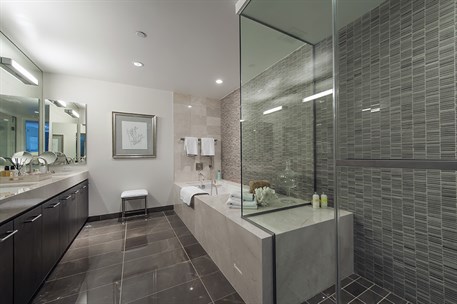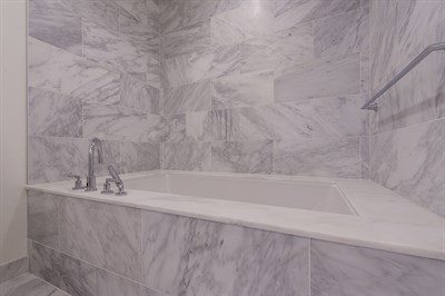 Public walkways and private balconies at the condos were tiled along with bathrooms, kitchens, a rooftop pool and spa, exterior veneer and even a pet spa room. Each condominium received extensive and lavish tile treatment in all bathrooms, with marble floors and shower walls in a number of units. Most of the porcelain and natural stone tile, including marble, travertine, quartzite and limestone, was imported from Italy, Turkey and Spain.