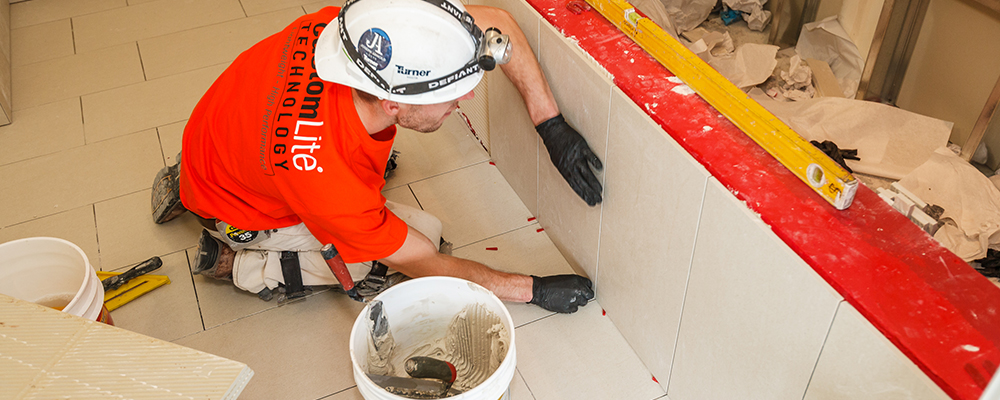 The Stadium Place West project was designed by award-winning ZGF Architects. CUSTOM’s RedGard® Waterproofing and Crack Prevention Membrane is the firm’s “basis of design” for specifying waterproofing of wet areas. RedGard was applied in all bathrooms with two 30-mil coats in showers providing a moisture vapor barrier that exceeds TCNA standards for even the high-humidity conditions found in continuous-use steam showers.