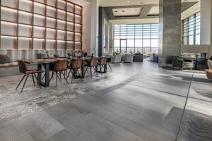 The process began with flattening the substrate to meet the tolerances for large format tile and hardwood flooring that were also installed on the project by ILG. A system of surface preparation products from CustomTech® designed for use under all floor coverings was chosen. TechPrime® A Advanced Acrylic Primer was applied to the concrete floors prior to leveling. This versatile primer prepares porous and non-porous surfaces for the application of self-leveling underlayment and improves the bond to the subsurface.