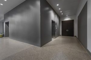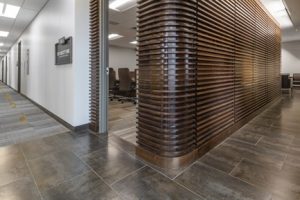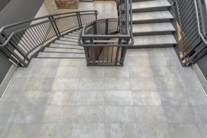 An expansive atrium anchors the building and walls are covered with 600 gauged porcelain panels (GPTP) in a 3.5 mm thickness. The material specified was Daltile’s SlimLite Classic Smoke, a 39 x 118-inch format. One of the challenges on the project was creating vertical courses with the panels to the height in the atrium and stairwells. As required by ANSI A108.19, crews and foremen received specialized training in use of the tools and methods required to successfully handle and install these demanding tile panels.