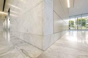 Craftsmen from Carnevale and Lohr fabricated and set 30″ x 30″ Taj Mahal quartzite pavers in the ground floor lobby using a dry pack method including ProLite as the bonding mortar. Matching material measuring 2.5 x 5-feet was mechanically anchored on lobby walls and 20 stories of tower lobby floors were set with the quartzite in a 24″ x 24″ format.