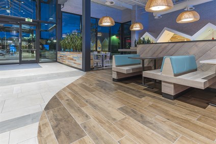 Gensler’s interior design team composed the patterns using porcelain tile from Stone Source, SpecCeramics and Crossville. “Our design intent was to bring the natural forms into the interior space adding warmth and a fluid floor pattern,” said Sean Park, project architect with Gensler. “On the practical end, the porcelain tiles are an excellent choice as they are durable for high-traffic commercial use and meet the slip co-efficient.”