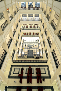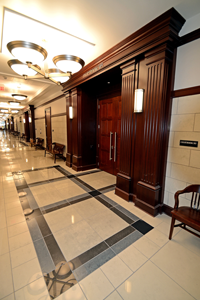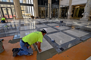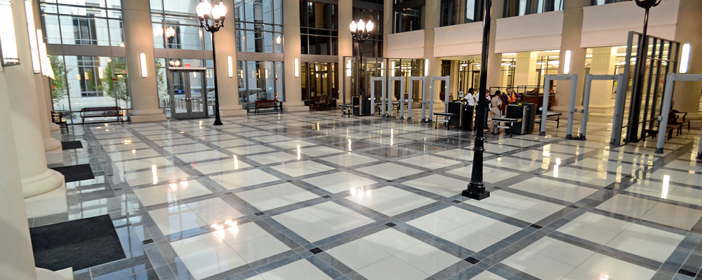 Completed in May 2012, the seven-story, approximately 800,000 sq. ft. structure has a façade made of pre-cast concrete and glass, and it houses 51 criminal and civil courtrooms, judges’ chambers, offices and meeting rooms. In addition to the large scope of the project, the renovation presented Moyer Marble and Tile, with a multitude of challenges —including a variety of different surface materials for the 300,000 sq. ft. interior space, substrate limitations and major time constraints.