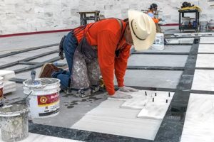 The stone workers used soft rubber mallets to beat in the bedded tile for a flat tiled surface. Suction cups were used to periodically check mortar coverage and transfer to ensure that it met the 95% requirement for natural stone, exteriors or wet areas. With the pool combining all of these elements, proper ridge collapse and coverage were especially important to protect the tile per ANSI A108.5.2.5.