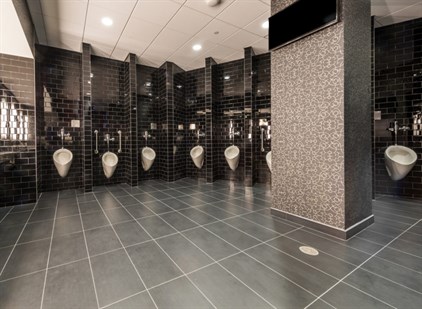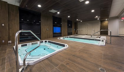 The balance of the ceramic and porcelain tile was set on floors with VersaBond® Flex Professional Thin-Set Mortar or VersaBond®-LFT Professional Large Format Tile Mortar, depending on size and location. This included traditional quarry tile at concessions, dramatic black ceramic tile in washrooms and wood-look planks to add a sauna-like feel to the hydrotherapy room. The tile contractor mandated optimum mortar coverage throughout the installation, which was achieved by backbuttering and ensuring that all tile in wet areas reached 95% coverage.