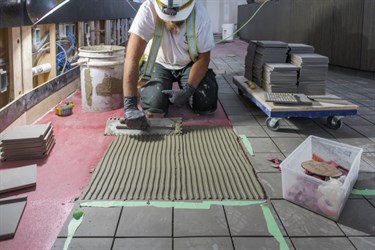 Surface preparation began with crews shotblasting all floors to a level 3 roughness prior to application of primers or membranes. Leveling was also required in some areas to attain the completely flat surface required by large format tile. To improve the bond and seal the surface, LevelQuik® Advanced Acrylic Primer was roller-applied to these floors. Then, LevelQuik® RS Rapid Setting Self-Leveling Underlayment was bucket poured from a feather edge up to 1-1/2″ deep. LevelQuik RS achieved an extra heavy duty service rating for this high-traffic commercial venue and cured in just 4 hours to allow same-day tiling.